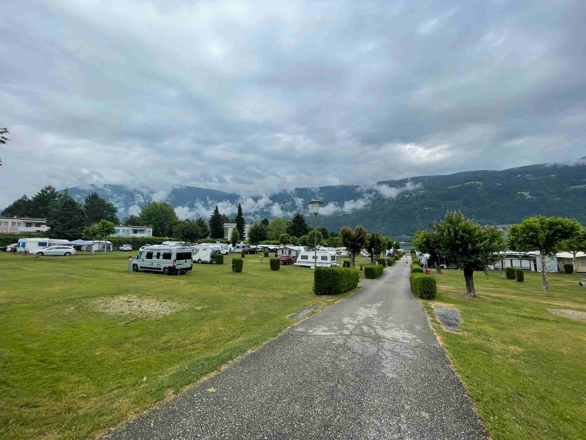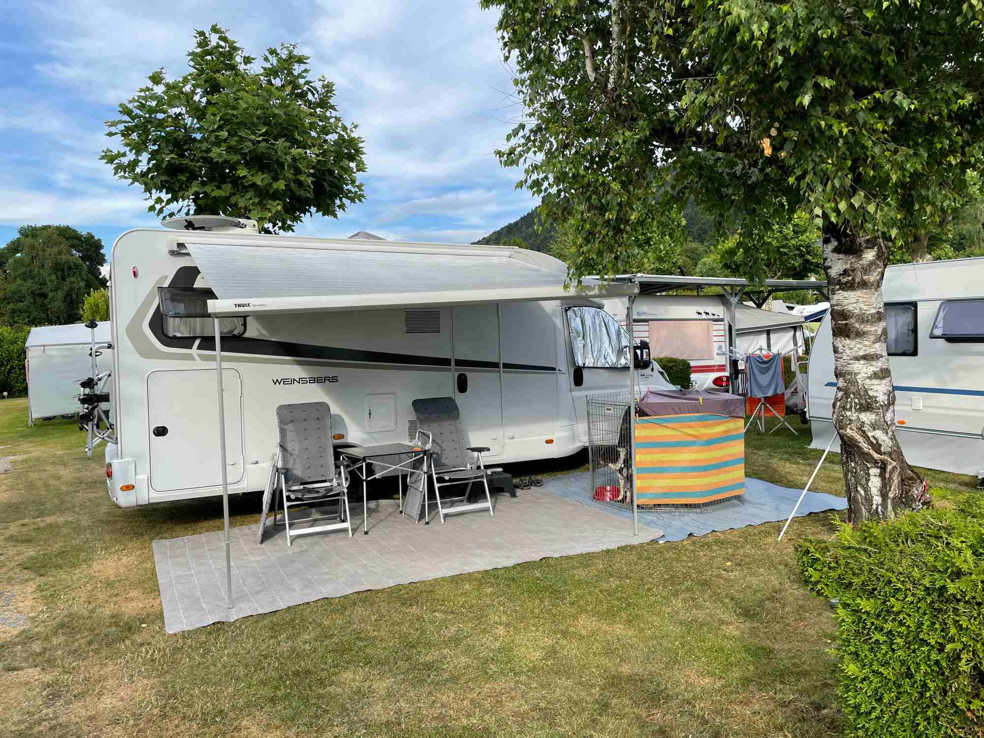 Jsme překvapeni, že kemp je poloprázdný. Tak málo lidí jsme zde ještě nezažili, a to sem jezdíme každý rok. Dozvídáme se, že se tu prohnala vichřice ve stejné době jako v Anině. Asi o něco horší. Odnesly to nějaké stromy a prý poměrně dost markýz. No to je důvod, když foukne zatahujeme. Poprvé jsme o markýzu přišli právě v tomto kempu.